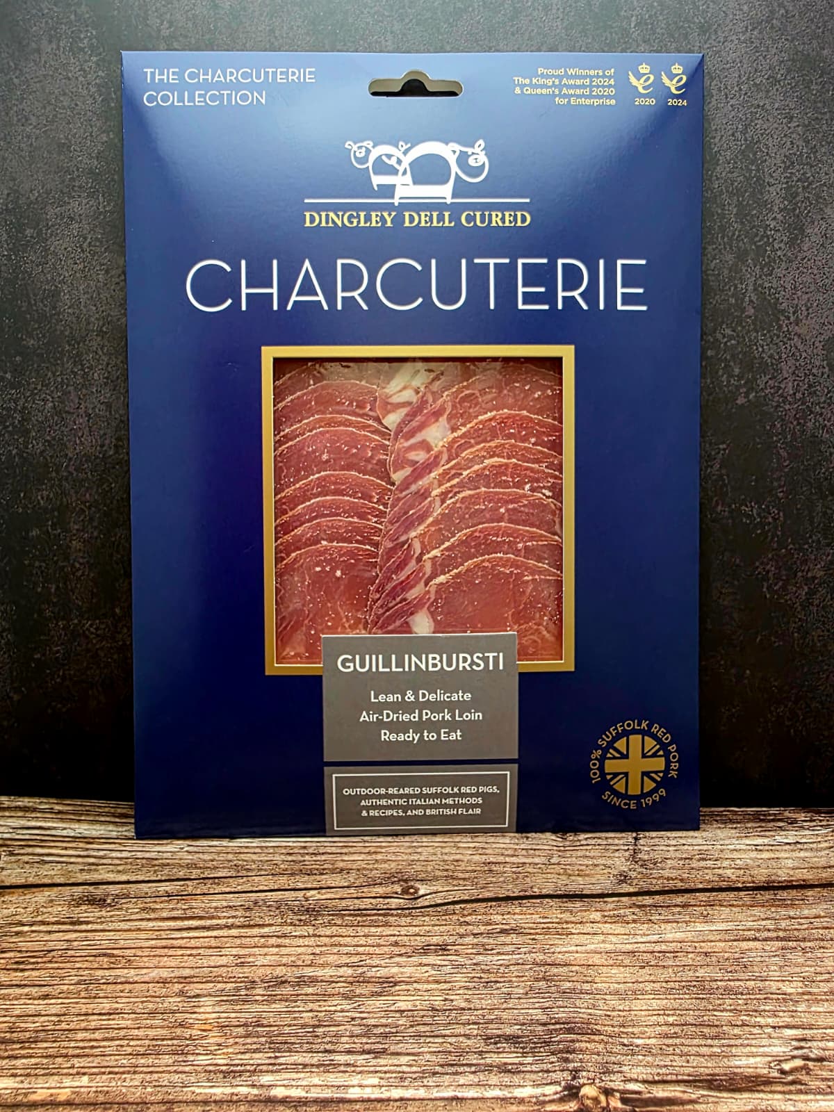 Guillinbursti is our dry-cured pork loin — lean, elegant and delicately seasoned. Refined in flavour and texture, it offers a clean savoury finish.