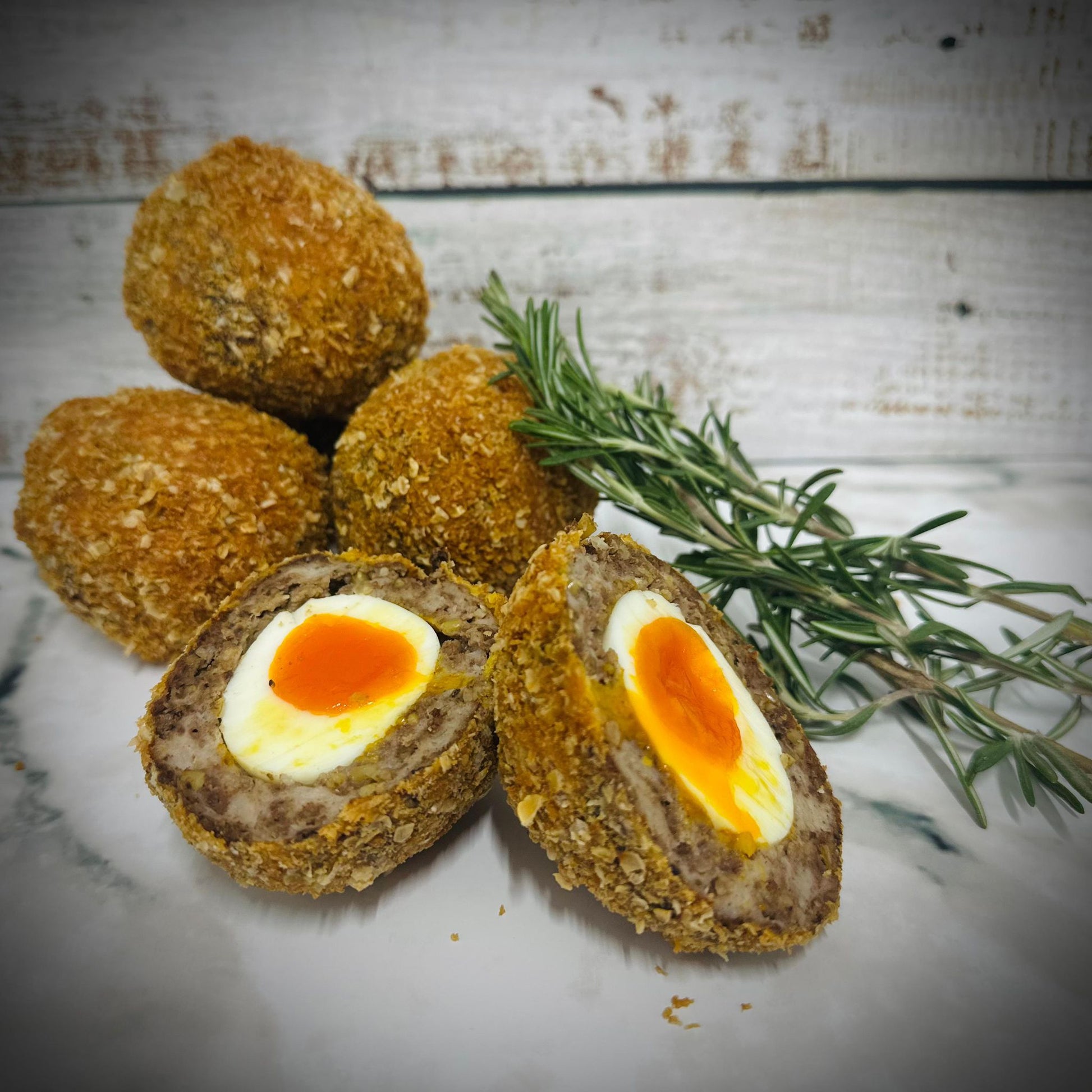 Our Gooey Scotch Egg is a proper deli favourite — a perfectly cooked soft-centred egg wrapped in seasoned sausage meat and finished with a crisp, golden crumb.